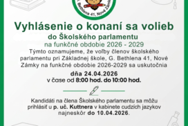 Milí žiaci, oznamujeme vám, že voľby členov Školského parlamentu na funkčné obdobie 2026 – 2029 sa uskutočnia 24. 4. 2026...