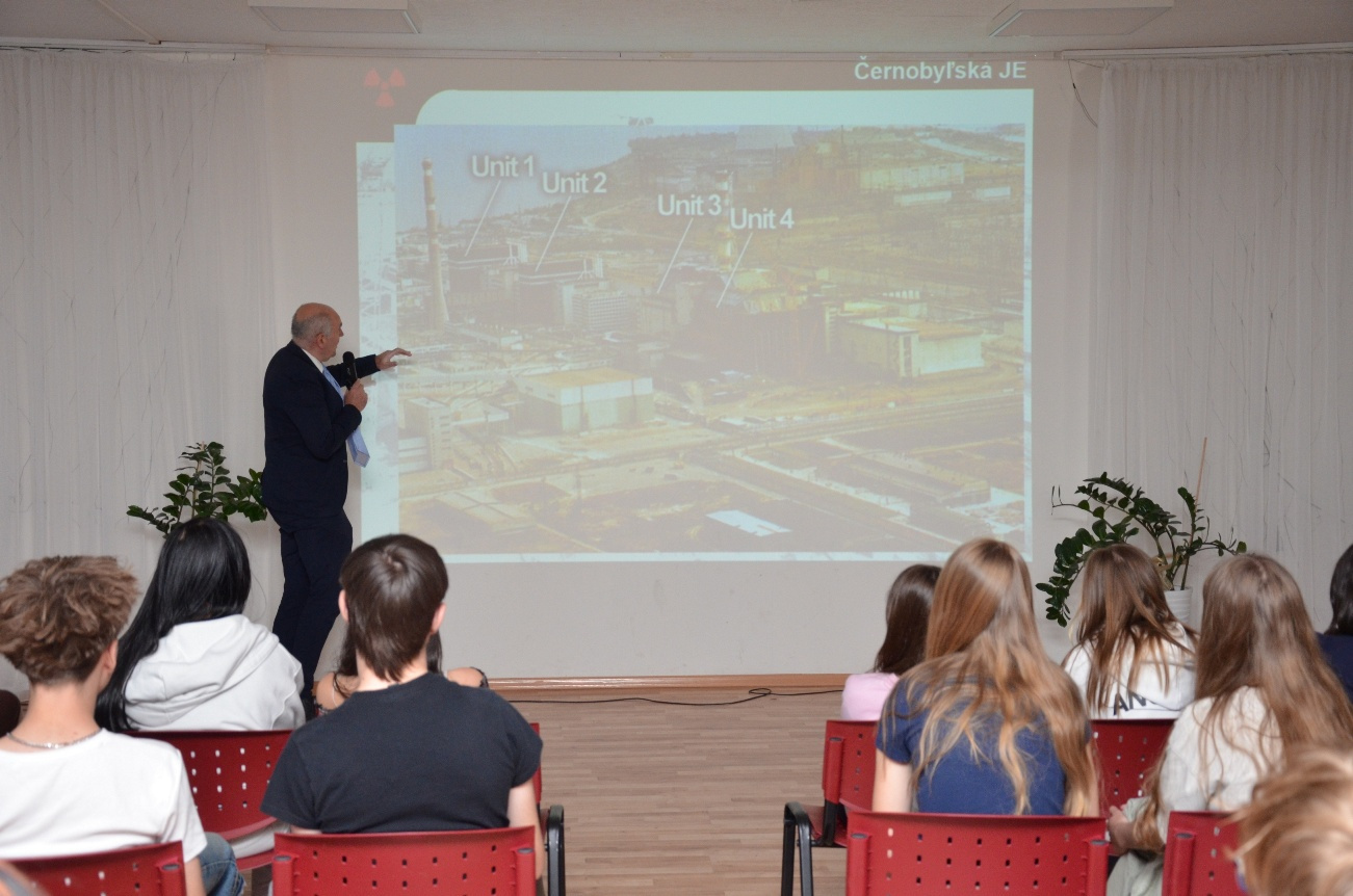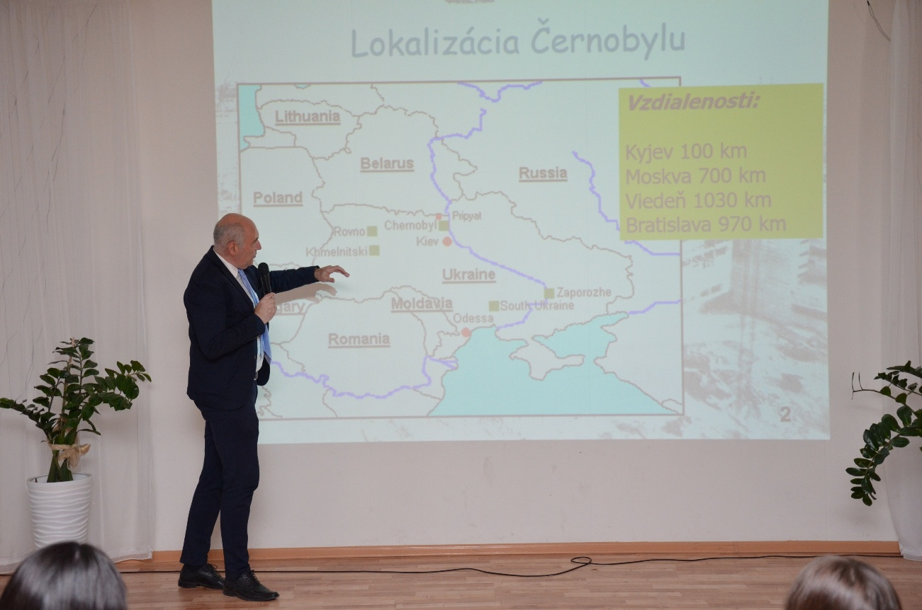 Následne sa slova ujal pán profesor Slugeň, ktorý doplnil Matúšovu prezentáciu a pomerne zjednodušenou formou vysvetlil príčiny výbuchu v černobyľskej jadrovej elektrárni, ako aj jej následky. Potom sa zameral na zmeny v otázke jadrovej bezpečnosti, ale aj na celosvetovej úrovni. Dnes by sa o podobnej tragédii svet dozvedel v priebehu niekoľkých minút vďaka sociálnym sieťam a moderným satelitným záberom. Takisto sa vo svete postupne vyradili reaktory typu RBMK práve kvôli konštrukčnej chybe, ktorá bola jednou z príčin havárie v roku 1986. Dozvedeli sme sa, že Slovensko sa môže stať najväčším svetovým výrobcom elektrickej energie z jadrových elektrární, pretože už teraz len o pár percent zaostávame za Francúzskom, ktoré vyše 60% energie vyrába z jadra.