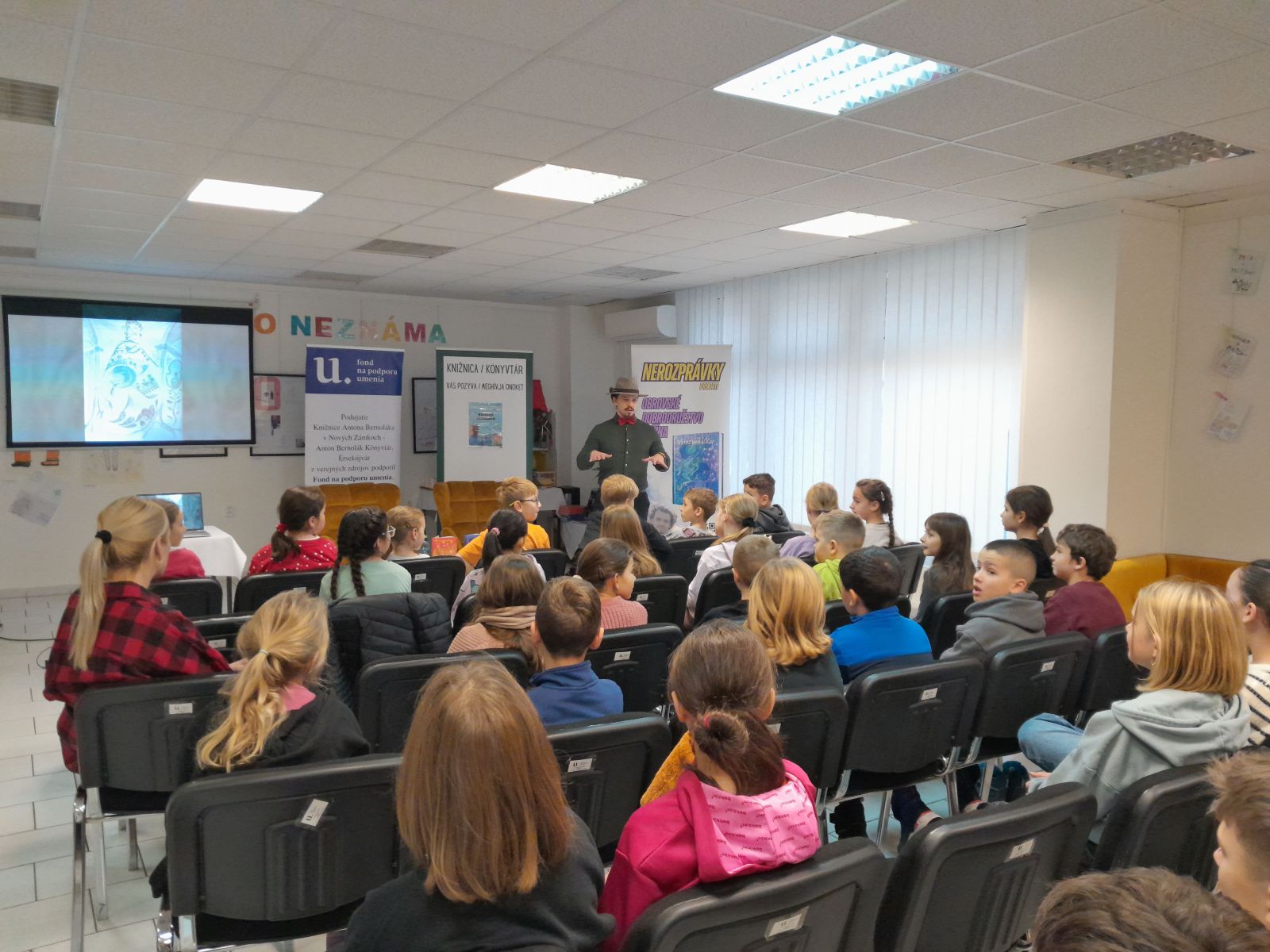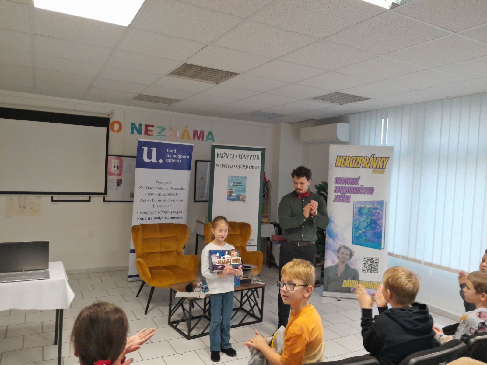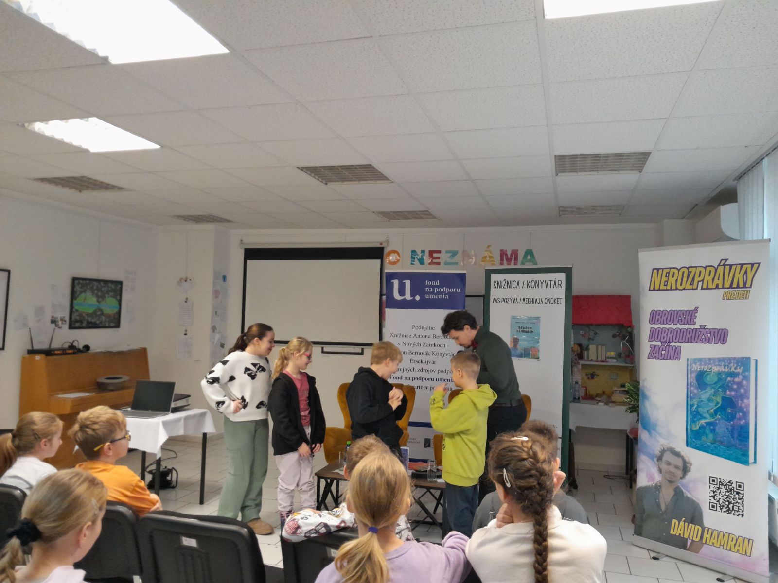 V stredu 10.12. sme triedy 4.A a 3.A navštívili knižnicu A. Bernoláka a zažili sme zaujímavú besedu so spisovateľom Dávidom Hamranom. Pán spisovateľ si pre nás pripravil veľa zaujímavých úloh a hier a na záver i losovanie o zaujímavú cenu. Prečítal nám úryvok zo svojich kníh. Napísal dve knihy: Nerozprávky pre detičky, ktorá je pre deti do 9 rokov a Nerozprávky pre deti, ktorú napísal pre deti od 10 rokov. Nájdeme v nich rôzne príbehy.
