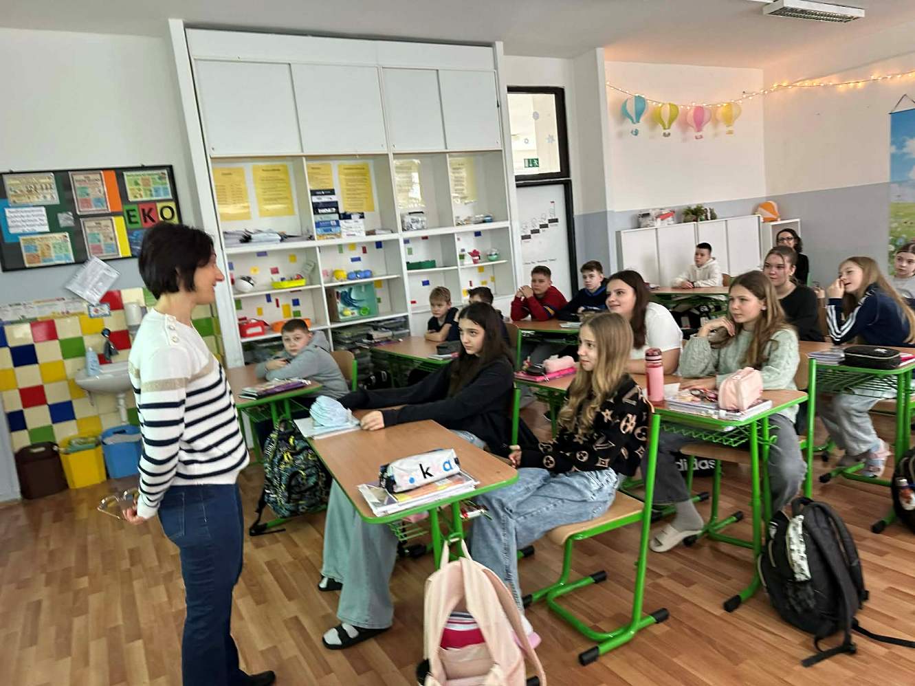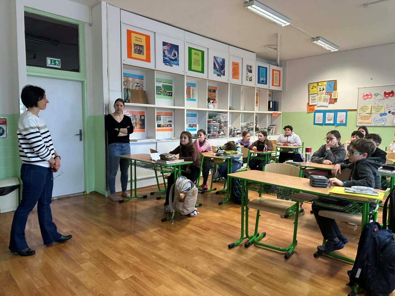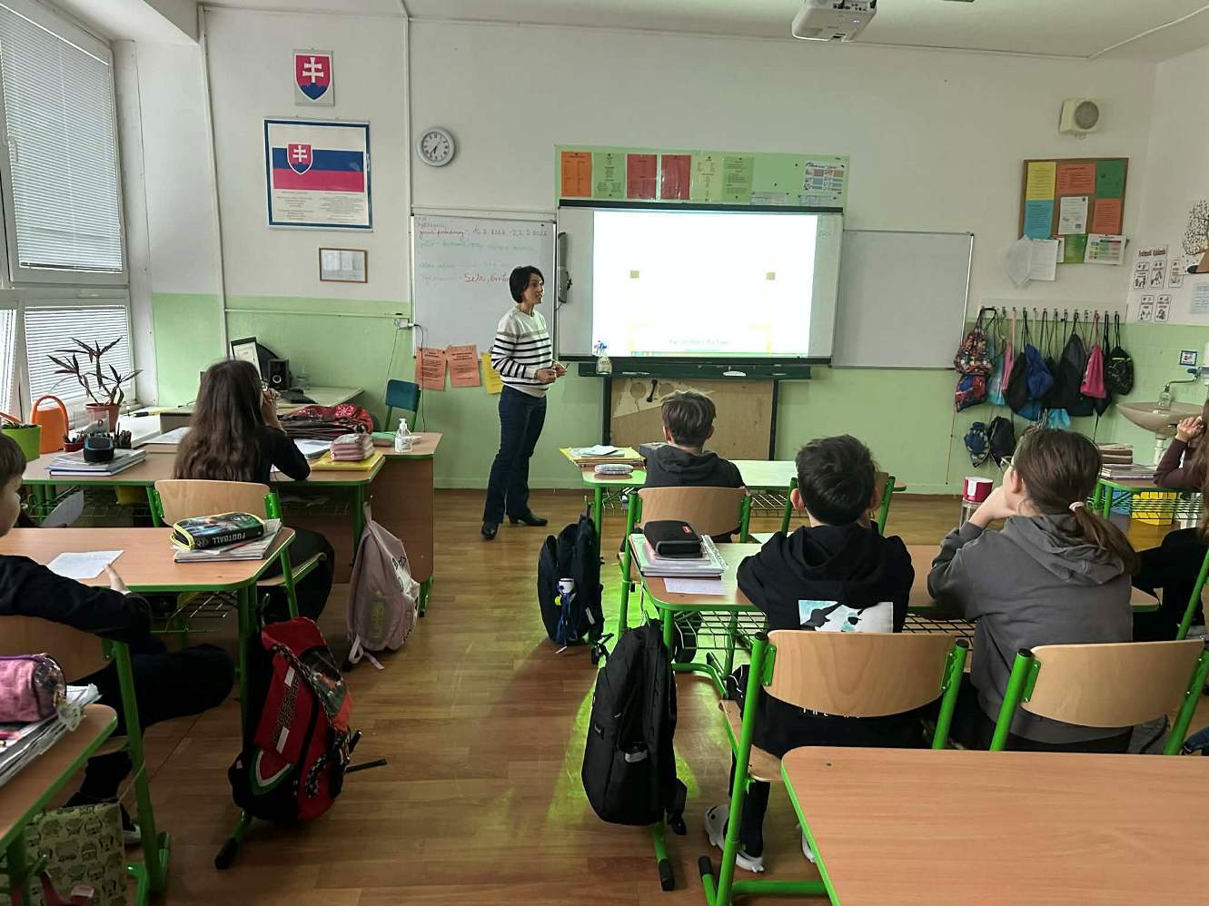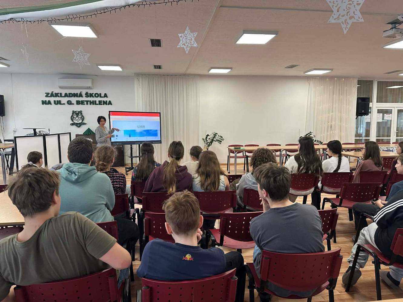 Svoj program začala u piatakov, ktorí jej porozprávali o našom meste a našej krajine. Potom sa naši žiaci dozvedeli veľa nových informácií o Francúzsku, o jeho kultúre, školskom systéme. Po krátkej prezentácii si žiaci precvičili komunikačné zručnosti v praxi. V 3. ročníku sa vyučovanie nieslo v hravej atmosfére – prostredníctvom piesní, básničiek a hier. Nové informácie a diskusie striedali hry a pohyb aj vo vyšších ročníkoch. Šiestaci sa rozhýbali pri behacom diktáte, preverili svoje vedomosti na Kahoote, siedmaci si pripravili detektívnu hodinu a po práci s tabletmi si zasúťažili na Kahoote. Zaujímavým prvkom programu bola aj konverzačná hodina v 9. ročníku, ktorá prebiehala v soľnej jaskyni a v spolupráci so špeciálnou pedagogičkou aj návšteva terapeutickej miestnosti Snoezelen.