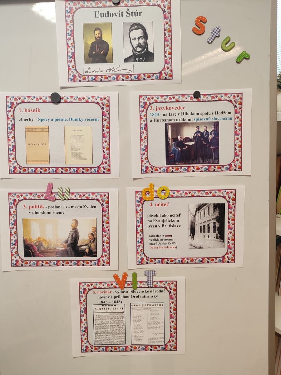 Nasledovali rôzne tvorivé aktivity – žiaci skladali portrét Ľudovíta Štúra, písali mu list, vytvárali plagát alebo vtipné „meme“ na tému „My chceme byť národ svojský!“. Niektorí sa pustili aj do moderného pretvárania Štúrových básní či výroby záložiek s jeho motívom.