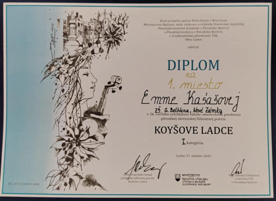 Dňa 17.10.2025 sa naša talentovaná recitátorka EMMA KASÁŠOVÁ (9.C) zúčastnila v celoslovenskom kole recitačnej súťaže...