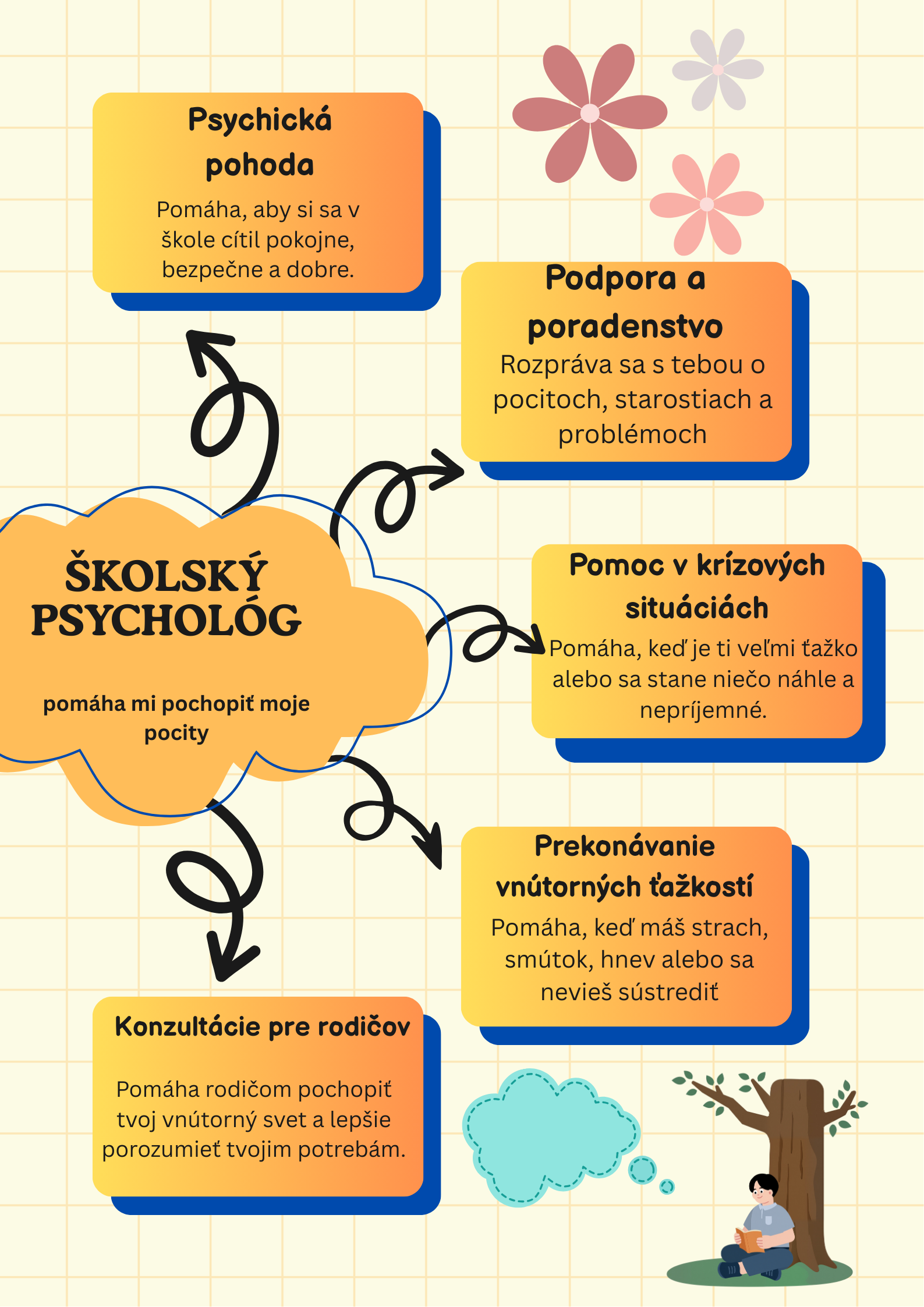 Školský psychológ je tu pre žiakov, rodičov a pedagógov. Svojou činnosťou prispieva k vzájomnej spolupráci školy a rodiny, ktorá má pozitívny vplyv na školskú úspešnosť žiaka.