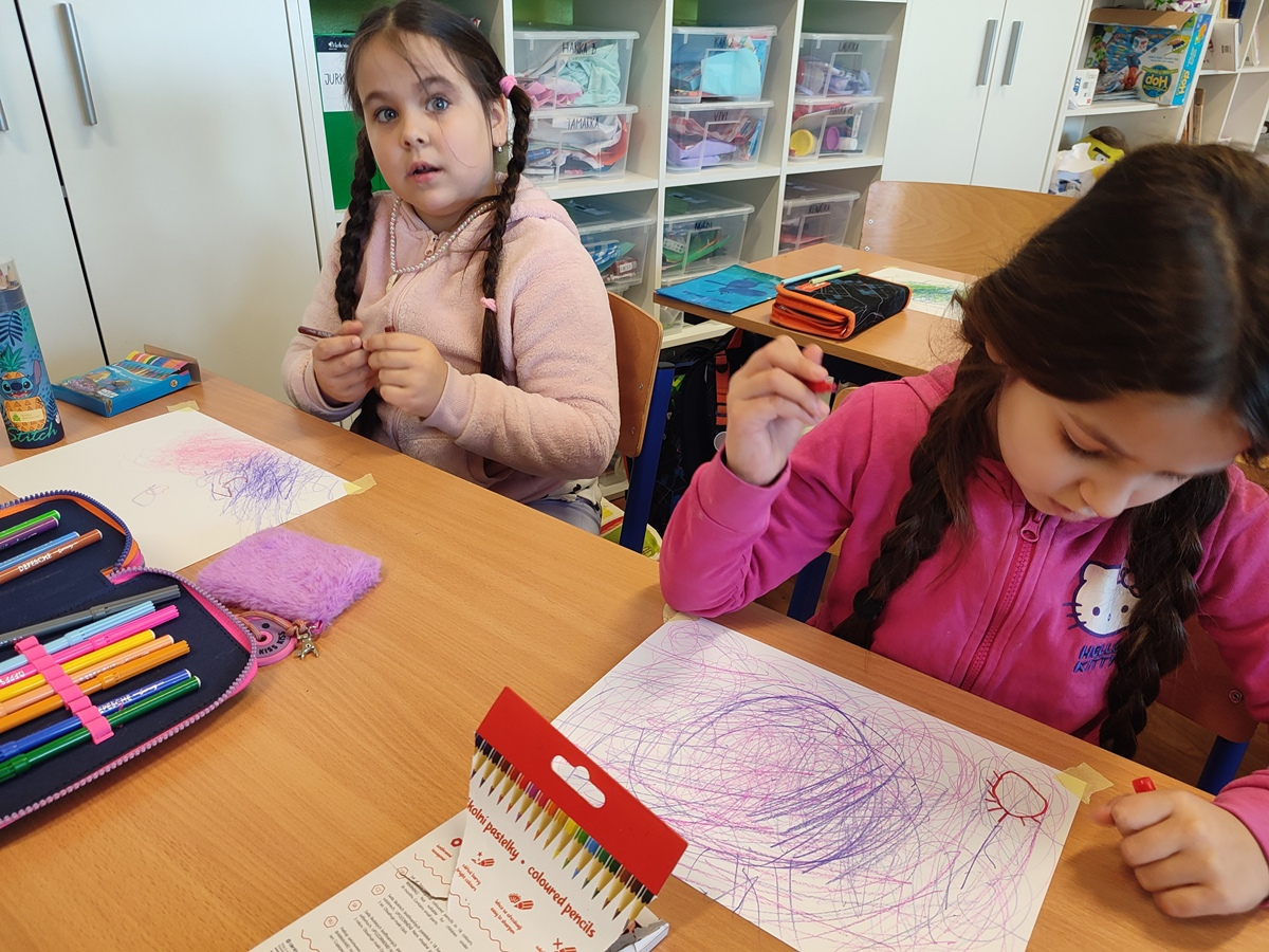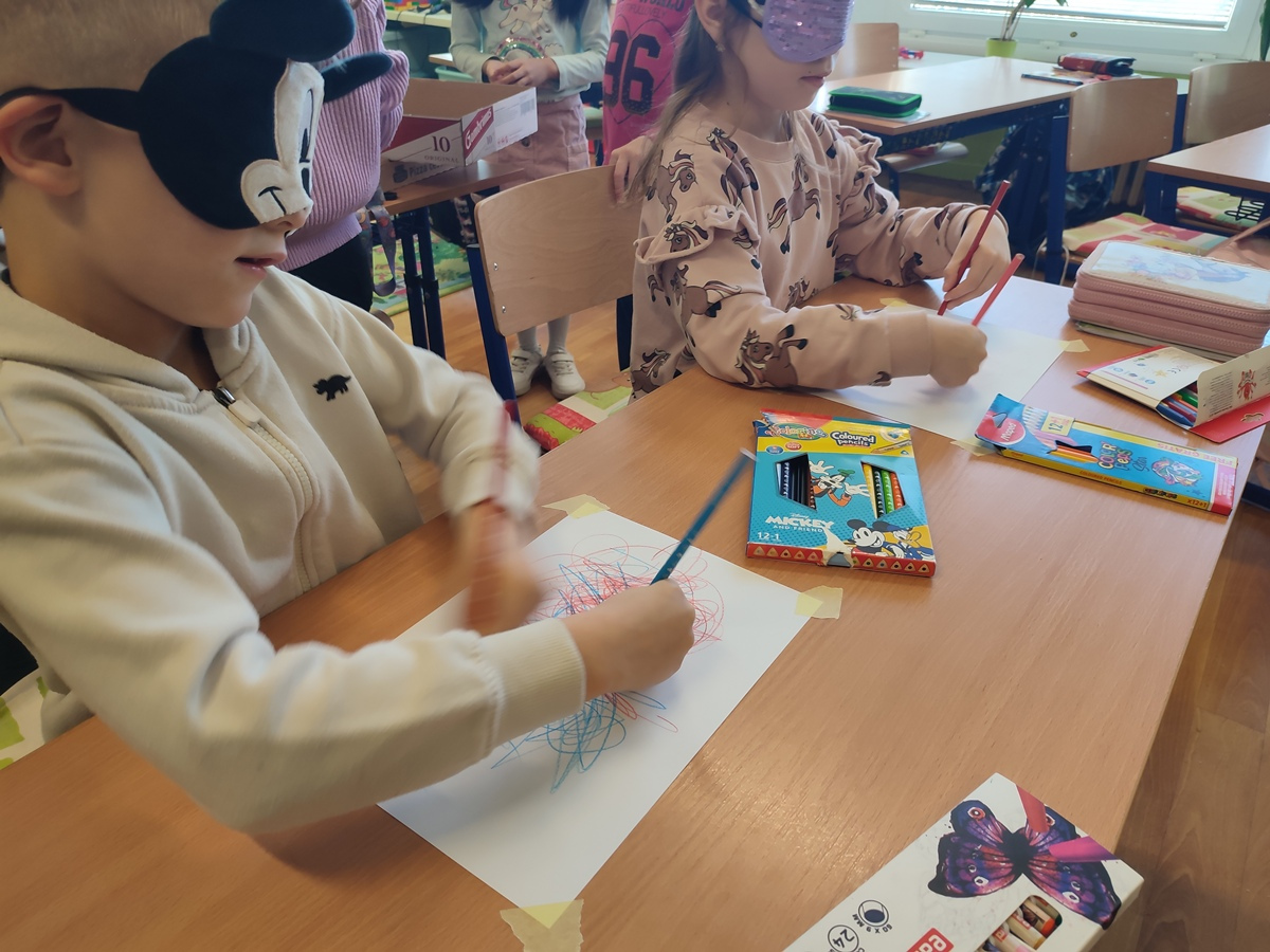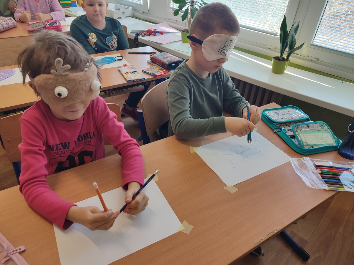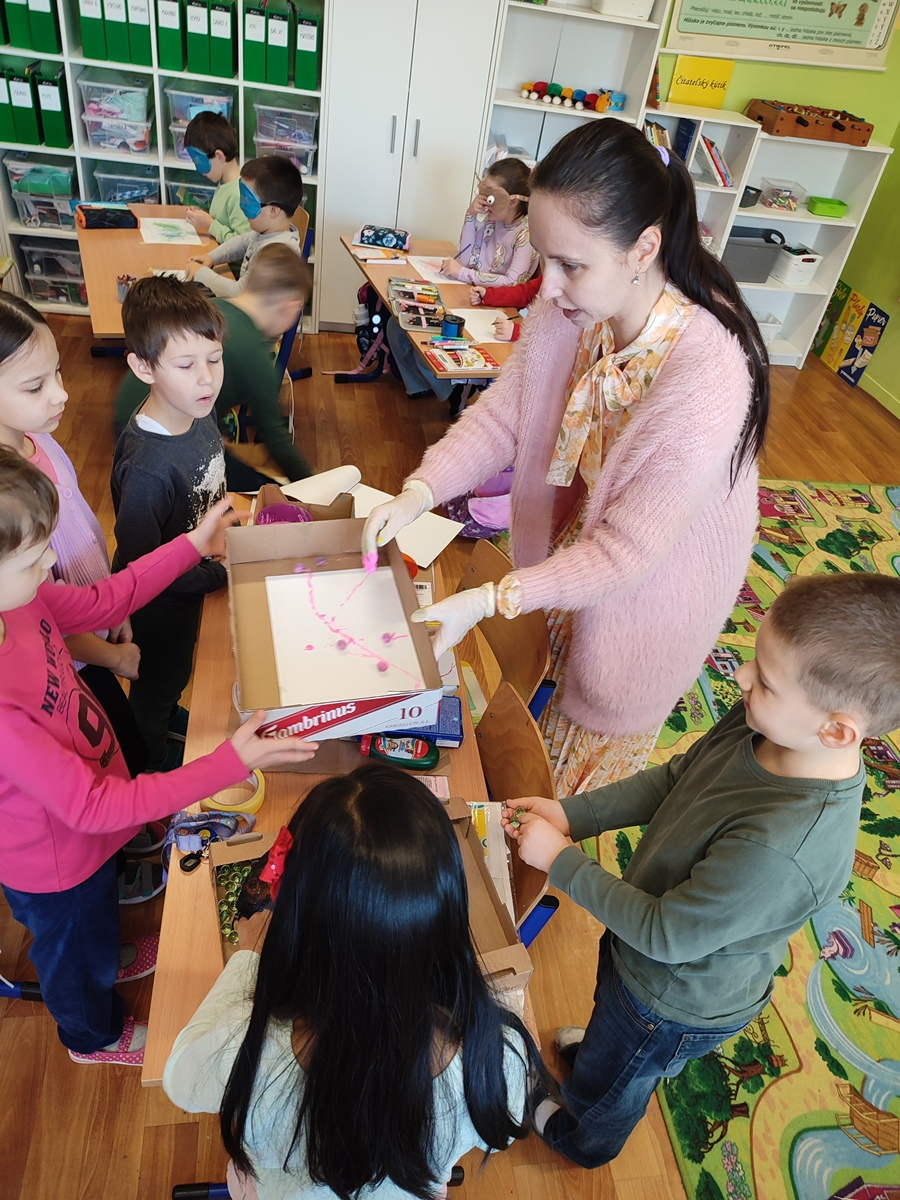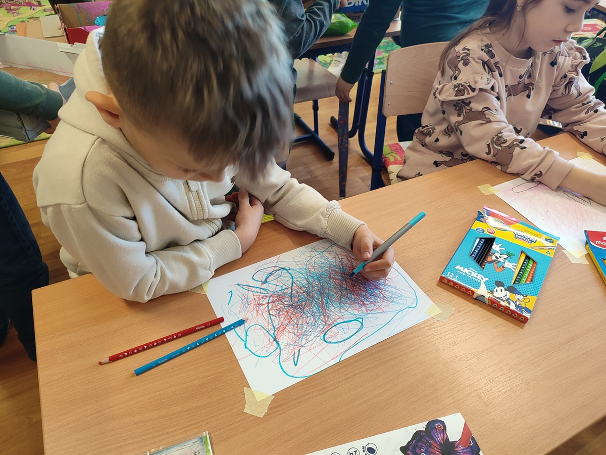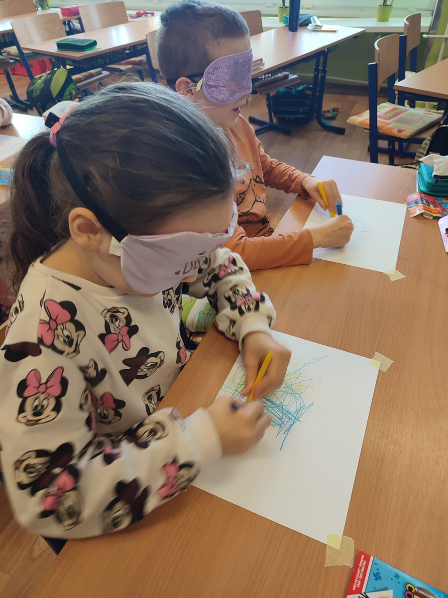 V ďalšej časti hodiny pracovala polovica triedy na aktivite voľná maľba so zatvorenými očami. Deti sa na chvíľu ponorili do sveta bez kontroly zraku a nechali svoju ruku voľne pohybovať po papieri. Vznikali línie, farebné plochy a tvary, ktoré boli výsledkom spontánneho pohybu a „stôp náhody“.