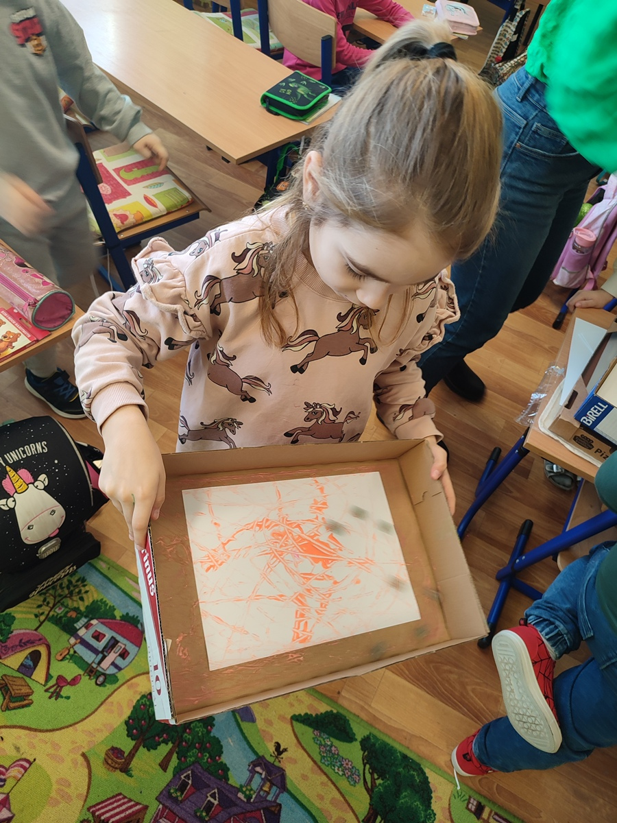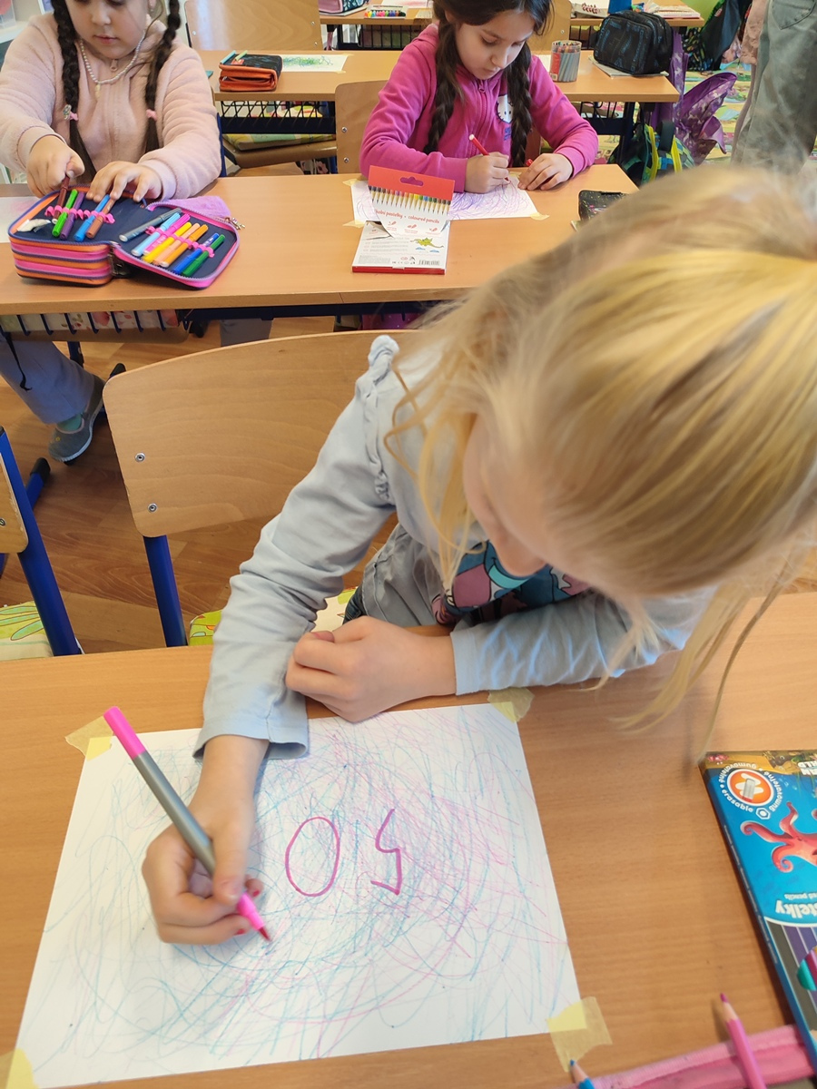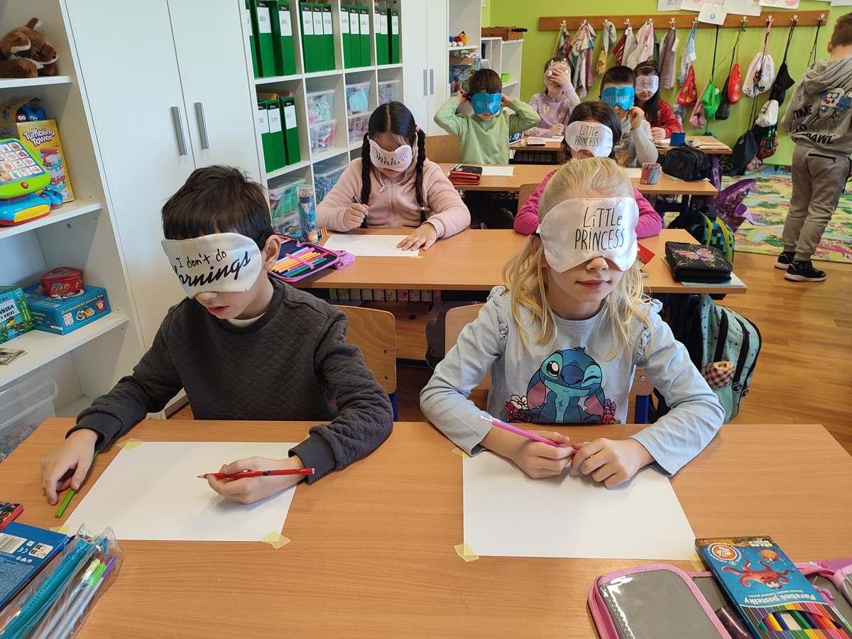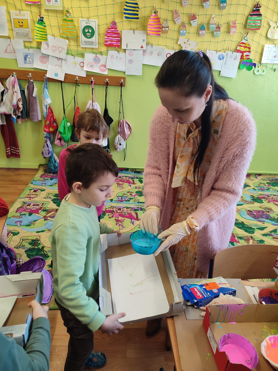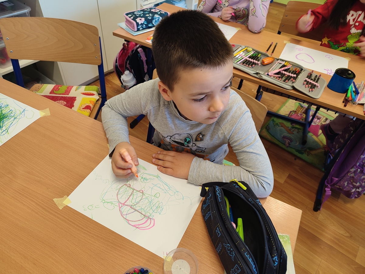 V ďalšej časti hodiny pracovala polovica triedy na aktivite voľná maľba so zatvorenými očami. Deti sa na chvíľu ponorili do sveta bez kontroly zraku a nechali svoju ruku voľne pohybovať po papieri. Vznikali línie, farebné plochy a tvary, ktoré boli výsledkom spontánneho pohybu a „stôp náhody“.