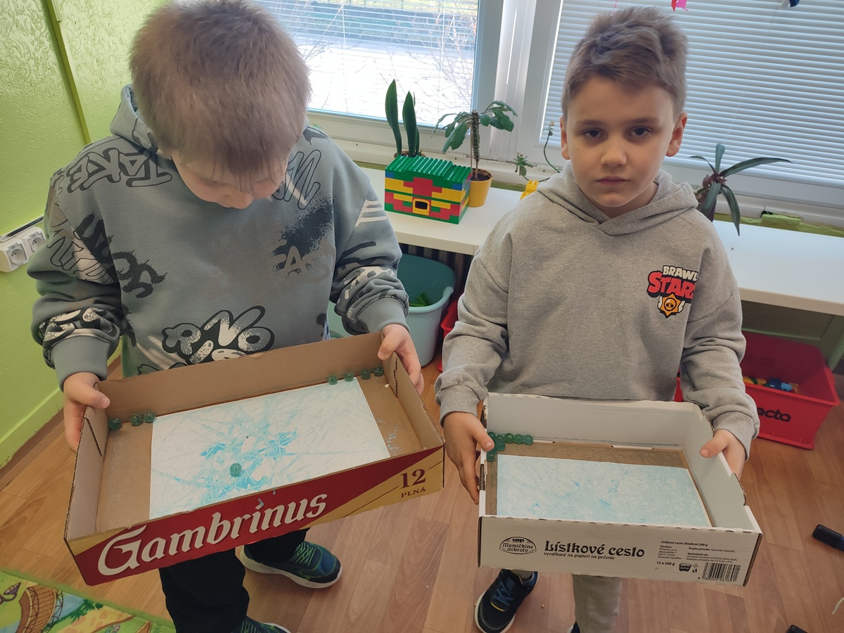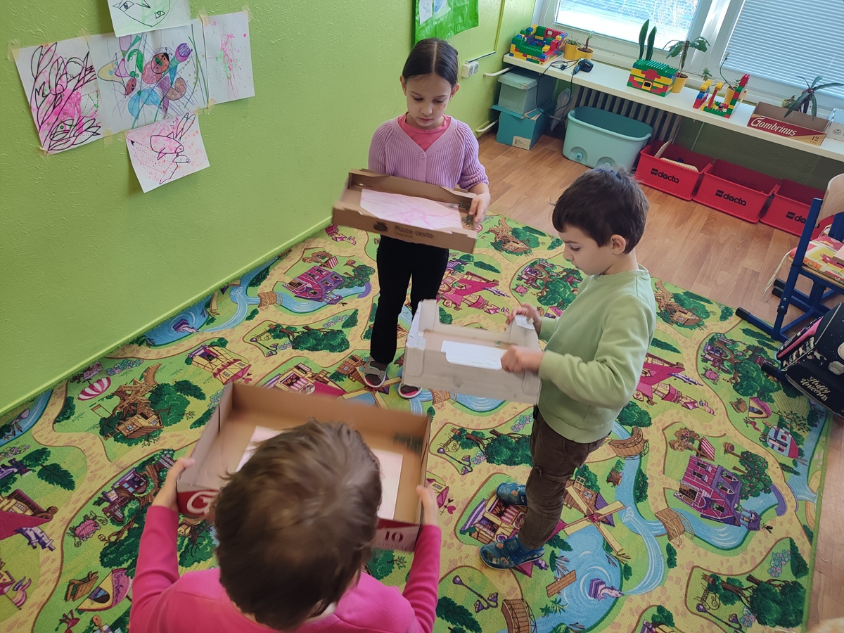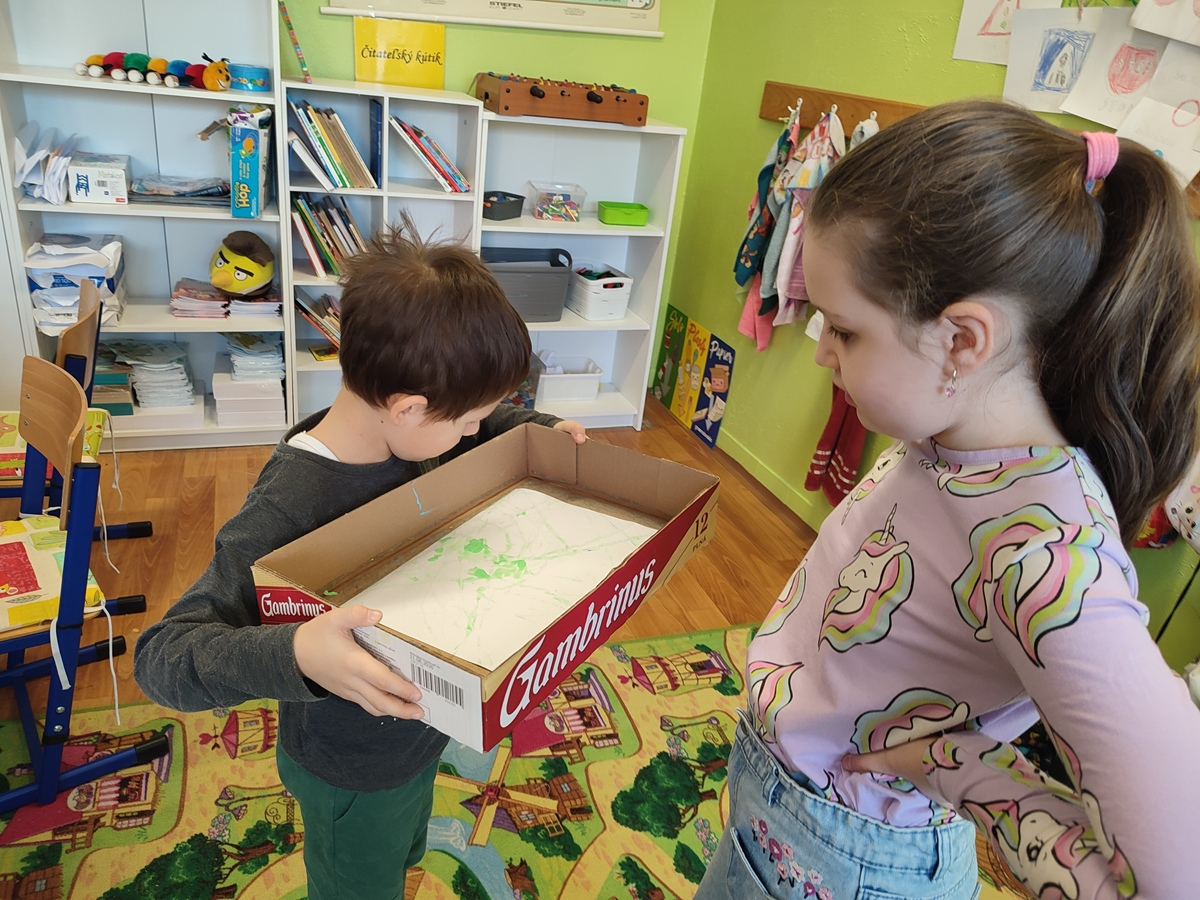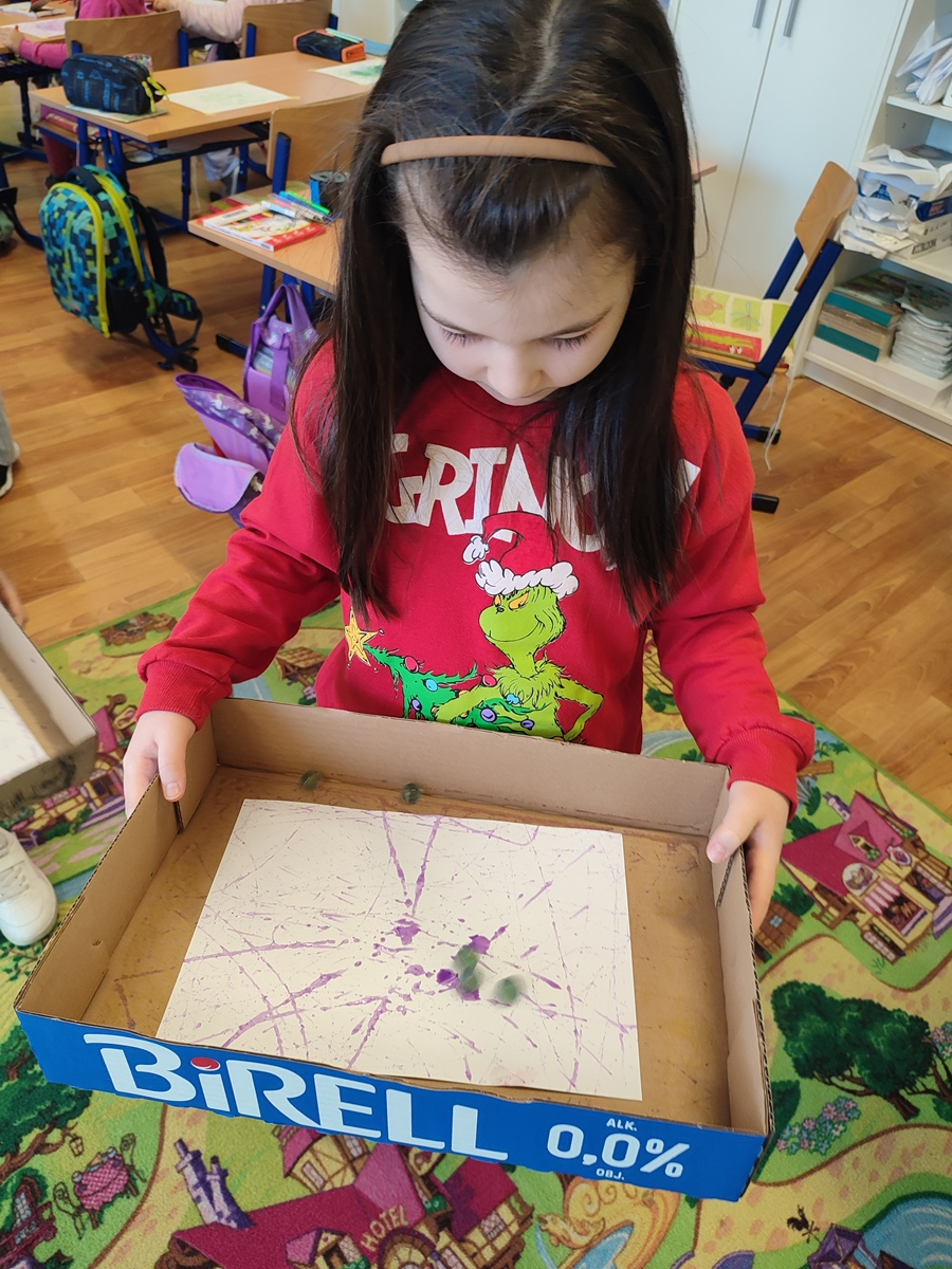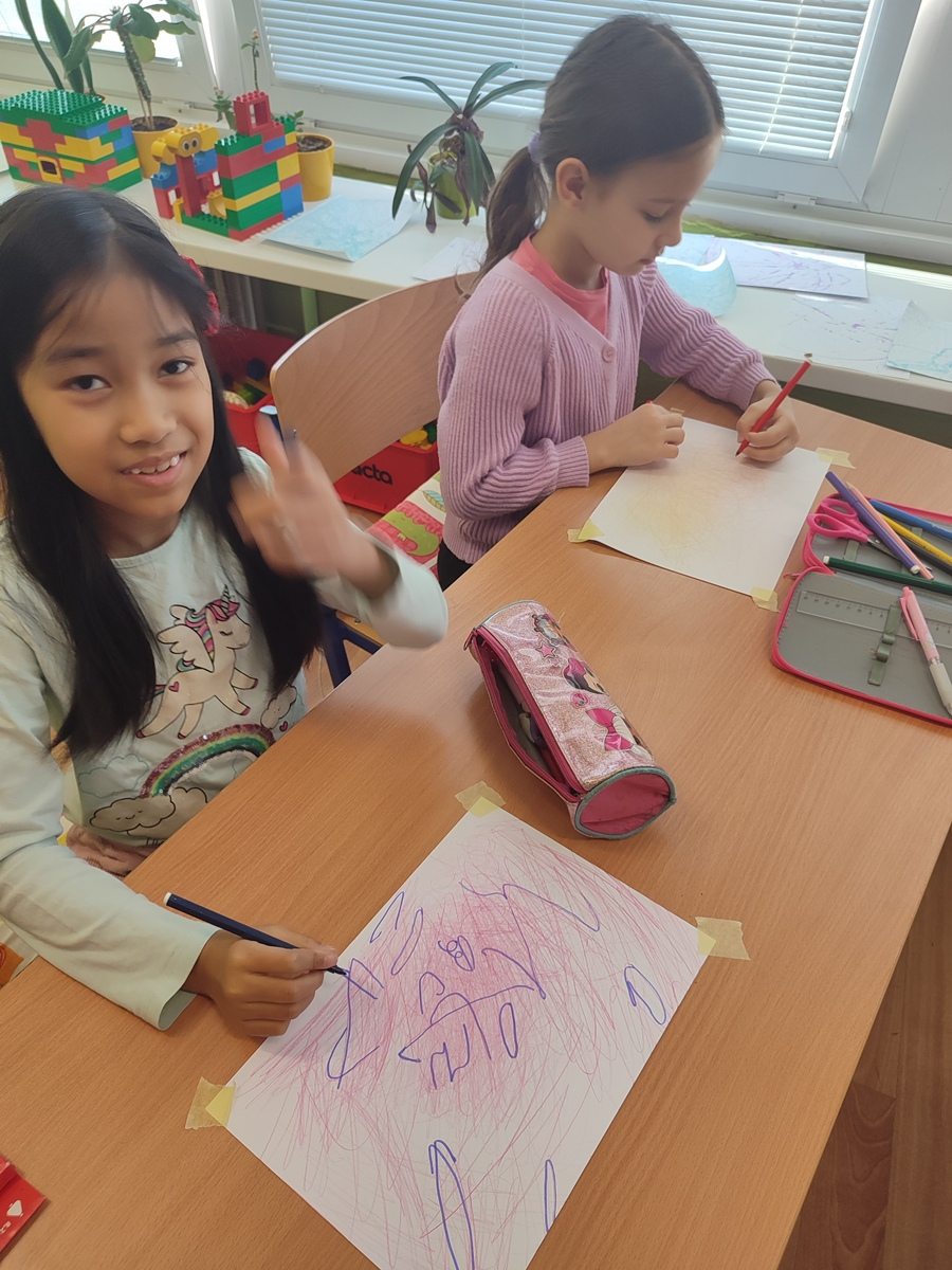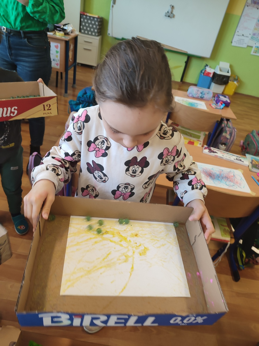 V ďalšej časti hodiny pracovala polovica triedy na aktivite voľná maľba so zatvorenými očami. Deti sa na chvíľu ponorili do sveta bez kontroly zraku a nechali svoju ruku voľne pohybovať po papieri. Vznikali línie, farebné plochy a tvary, ktoré boli výsledkom spontánneho pohybu a „stôp náhody“.