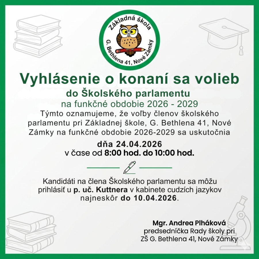 oznamujeme vám, že voľby členov Školského parlamentu na funkčné obdobie 2026 – 2029 sa uskutočnia  24. 4. 2026 v čase od 8:00 do 10:00 hod.